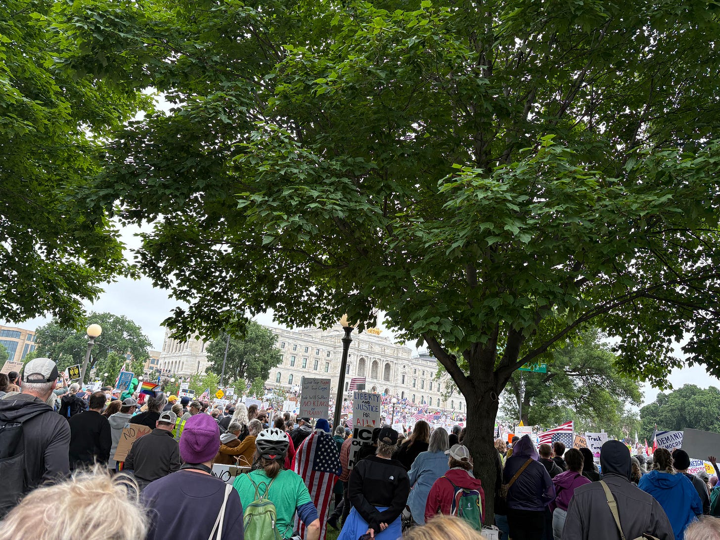 I was so afraid that I almost didn’t walk from my home to downtown St. Paul to attend Saturday’s No King rally. The man who killed state Representative Melissa Hortman and her husband, Mark, and wounded state Senator John Hoffman and his wife, Yvette, is an iteration of the scariest monster in my head. I feared he was part of an organized group. I imagined a mob similar to the people who stormed the Capitol on January 6, 2021.